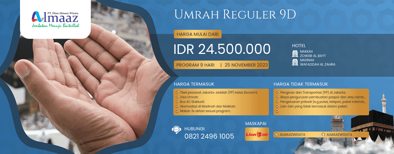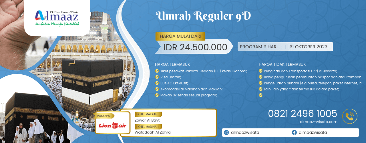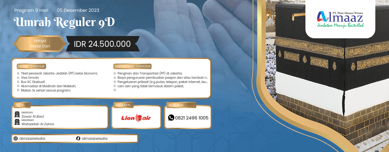 PT. Dian Almaaz Wisata merupakan Travel Umrah Resmi dari pemerintah yang telah melayani banyak keberangkatan jamaah umrah sejak tahun 2009 hingga sampai saat ini. Kepastian tanggal keberangkatan serta layanan yang profesional menjadikan PT. Dian Almaaz Wisata menjadi travel umrah terbaik di Indonesia